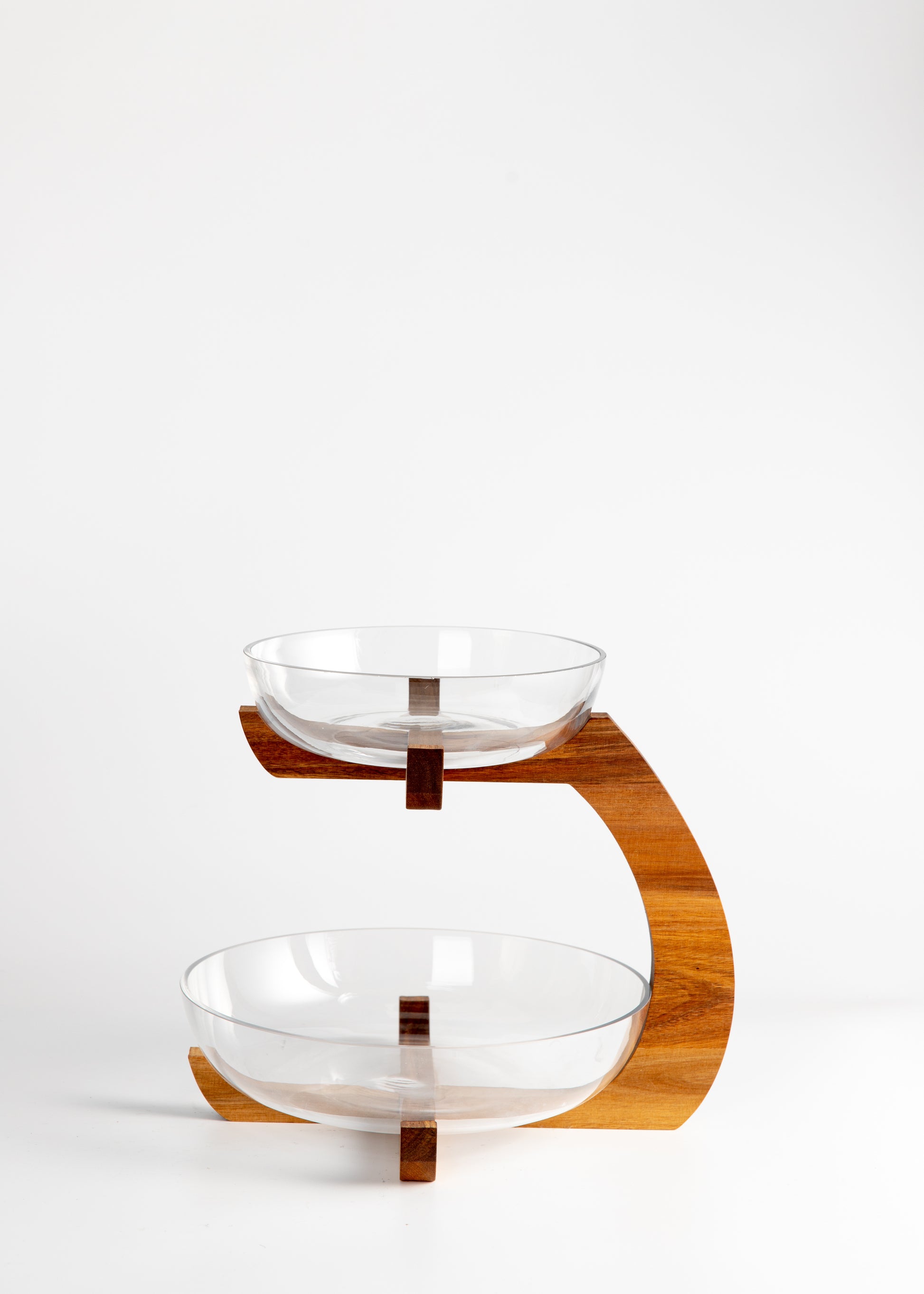 Dubbele glazen serveerschaal op acaciahouten standaard