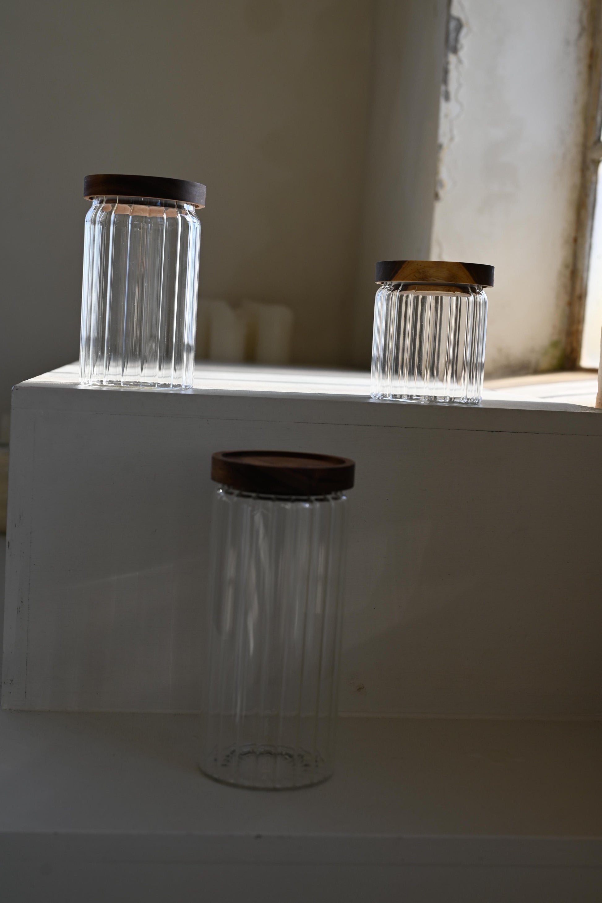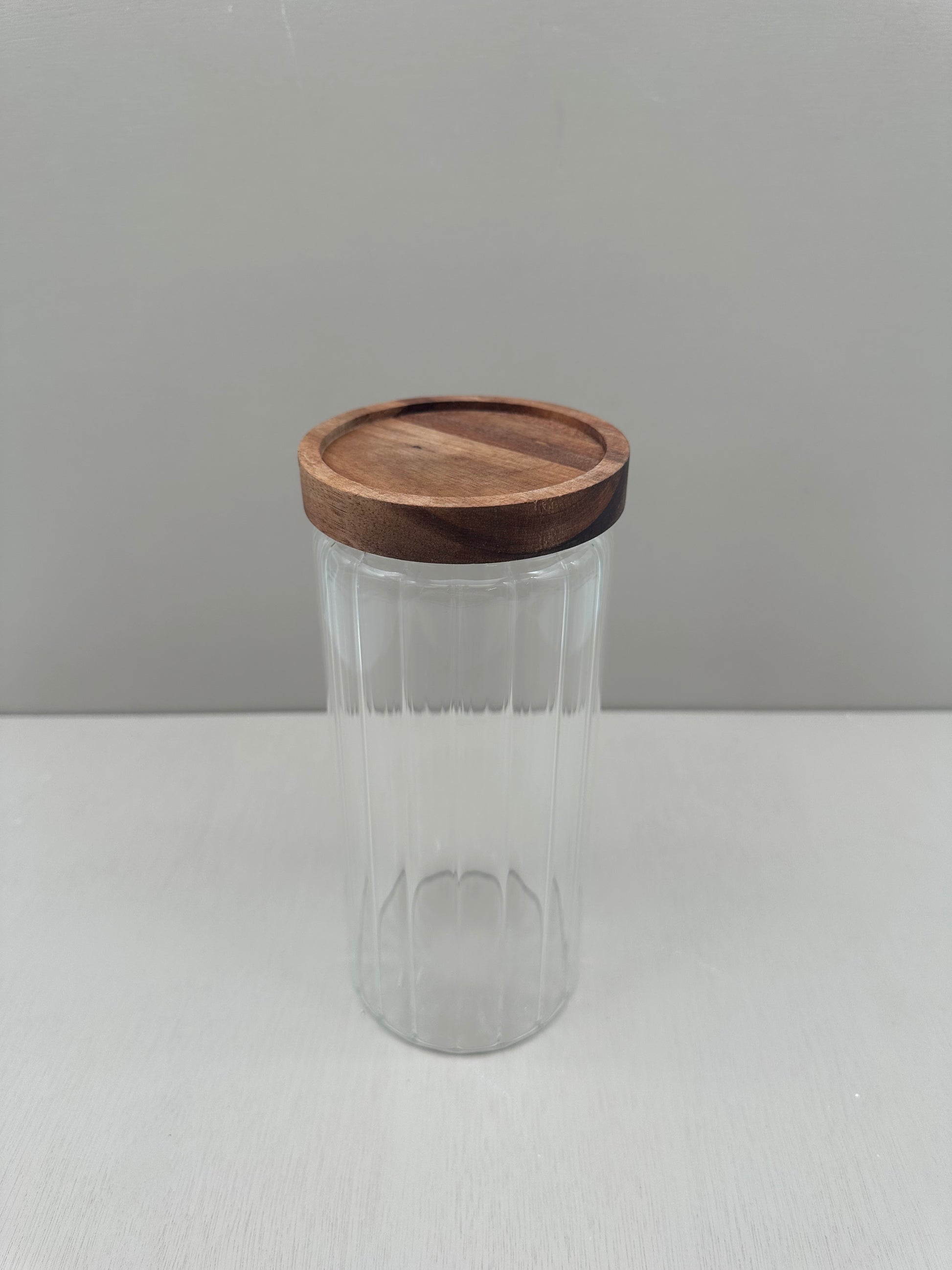 Deze stijlvolle glazen voorraadpot met een houten deksel combineert functionaliteit met een tijdloos design. De verticale ribbelstructuur van het glas geeft een verfijnde uitstraling, terwijl de natuurlijke houten deksel zorgt voor een warme, organische touch.